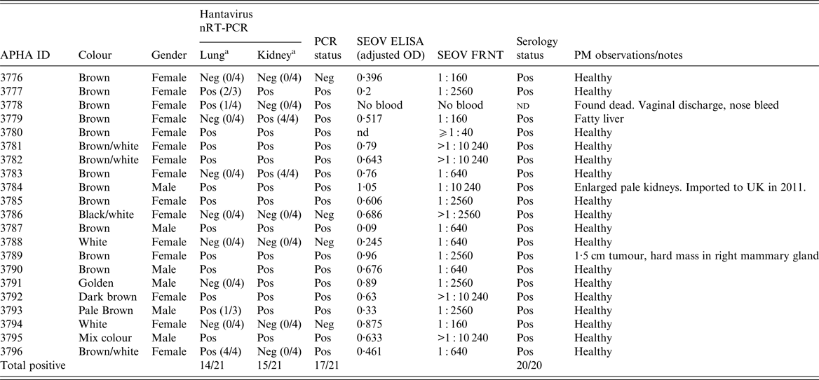 Table 1. Hantavirus nRT–PCR (L gene) and serology results for the 21 pet rats (Rattus norvegicus) in the Cherwell Colony