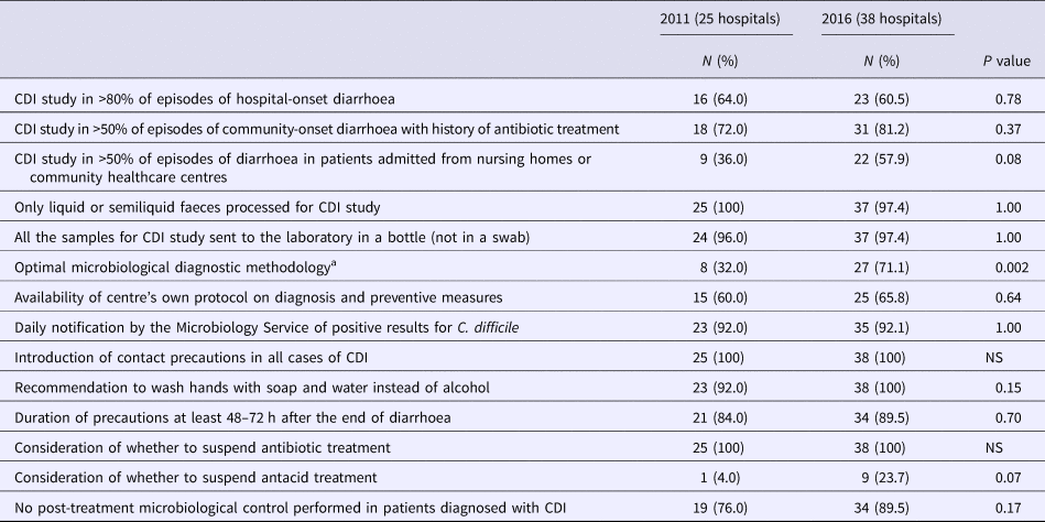 Table 3 shows the results of the surveys on CDI diagnosis and prevention. With regard to the diagnostic methods, a significant increase in the application of the optimal diagnostic algorithm was observed. There was an increase in the search intensity for CDI in patients admitted from nursing homes or from community health centres and in patients with community-acquired diarrhoeas, as well as greater adherence to most of the preventive measures recommended, although the differences did not reach statistical significance.