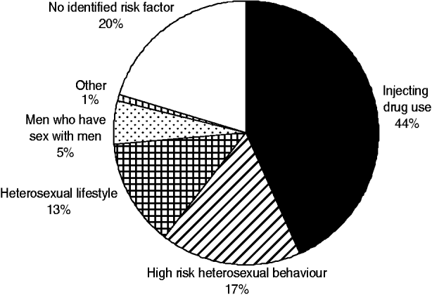 From July 2001 to December 2005 (54 months), 237 cases of acute HBV were identified. Figure 1 shows the distribution of cases over time. Figure 2 shows that the number of cases who reported injecting drug use as a risk factor started to increase from July 2001 and peaked in both IDU and non-IDU groups in the quarter from July to September 2002. Injecting drug use was the most likely route of transmission reported by 44% (104/237) of cases overall (Fig. 3). Heterosexual intercourse was the second most likely route of transmission overall with 30% (71/237) of cases, including 17% (40/237) who reported sexual intercourse with a partner at high risk of HBV (IDU, CSW, client of CSW, case of jaundice or chronic HBV) and high-risk heterosexual behaviour (⩾2 new partners in the year before diagnosis) reported by 13% (31/237) of cases. Five per cent (13/237) of cases reported male homosexual or bisexual intercourse. In three (1%) cases another risk factor was identified (blood transfusion, bloody fight, community needlestick injury). In 20% (47/237) of cases no risk factor was reported. Males made up 71% (168/237) of all cases. The median age of all cases was 33 years [interquartile range (IQR) 29–41years].