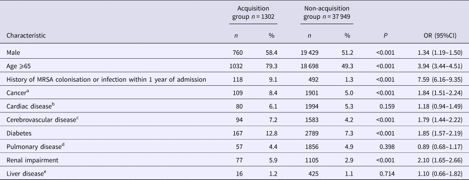 Table 1 presents the baseline characteristics of the acquisition and non-acquisition groups. Patients in the acquisition group were more likely to be male (OR 1.34, 95% CI 1.19–1.50), 65 years and above (OR 3.94, 95% CI 3.44–4.51), and have a history of MRSA colonisation or infection in the preceding admission over the last year (OR 7.59, 95% CI 6.16–9.35). Patients in the acquisition group were also more likely to have a history of cancer (OR 1.84, 95% CI 1.51–2.24), cerebrovascular disease (OR 1.79, 95% CI 1.44–2.22), diabetes (OR 1.85, 95% CI 1.57–2.19) and renal impairment (OR 2.10, 95% CI 1.65–2.66).