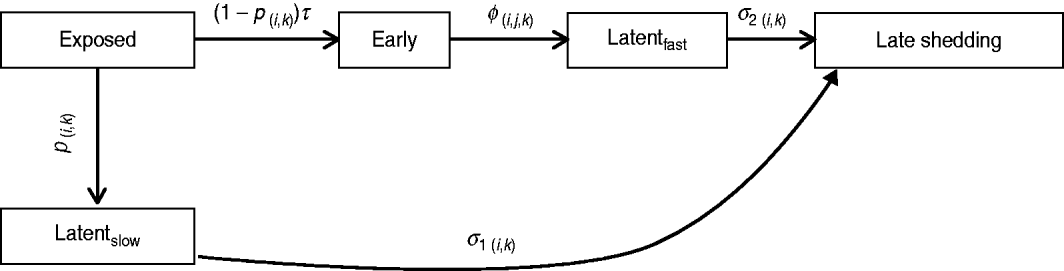 Fig. 1. Graphical representation of MAP infection compartments. Exit from exposed compartment is divided into a portion becoming early shedders (1 – p) at rate τ and a portion becoming slow-progressing latents (p). Exit from exposed is dependent on age at infection (i) and dose method/strategy (k). Exit from early shedding (φ) is dependent on age (i), dose (j) and method (k), while exit from both latent categories, fast-progressing latent (σ2) and slow-progressing latent (σ1), is only dependent on age (i) and dose method (k).