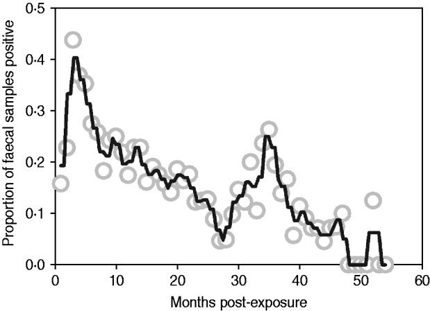 Fig. 2. Proportion of animals with a positive faecal sample each month following exposure across all studies. Grey circles indicate monthly proportion of shedding animals. Black line represents the smoothed running average (nearest neighbours). Contaminated samples are excluded from the denominator.