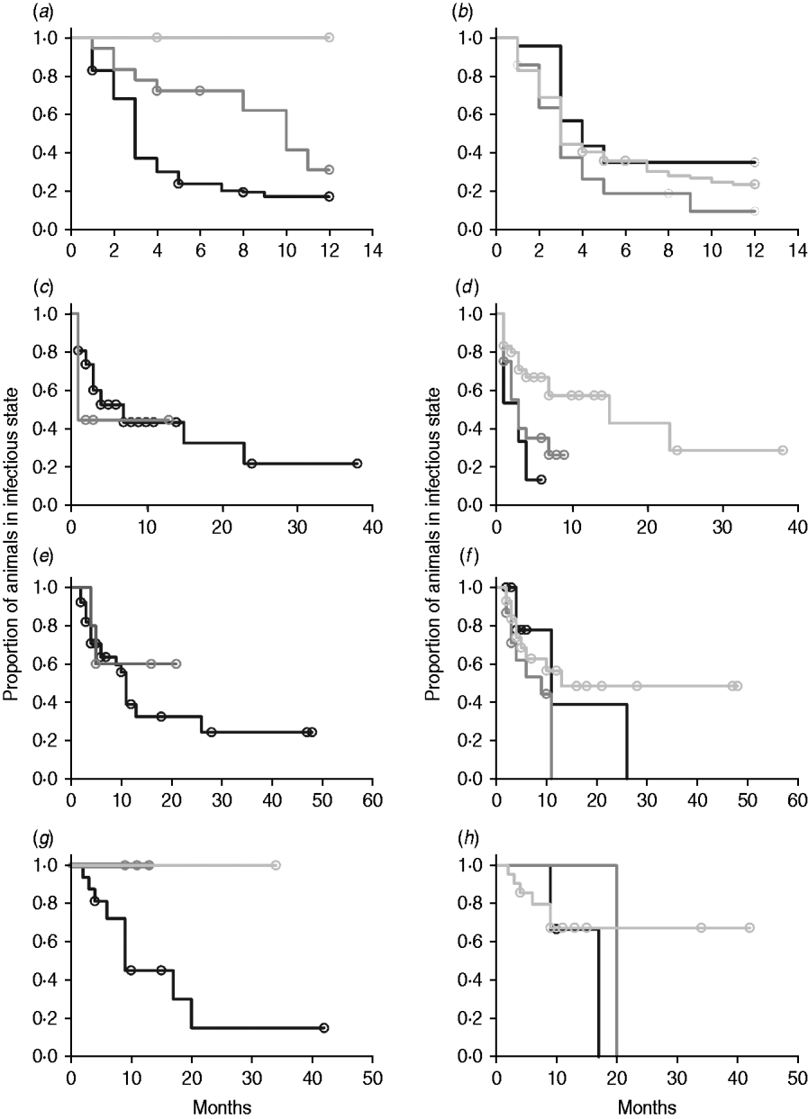 Fig. 3. (a–h) Kaplan–Meier plots of duration within infection categories: (a, b) exposed; (c, d) early shedding; (e, f) fast-progressing latent; and (g, h) slow-progressing latent. Left panels (a, c, e, g) are stratified by age at challenge (category 1, <3 months; category 2, 3 months-1 year; category 3, >1 year). Right panels (b, d, f, h) are stratified by challenge dose (category 1, ⩽107 c.f.u.; category 2, >107–109 c.f.u.; category 3, ⩾109 c.f.u.). Black line, category 1; dark grey line, category 2; light grey line, category 3.