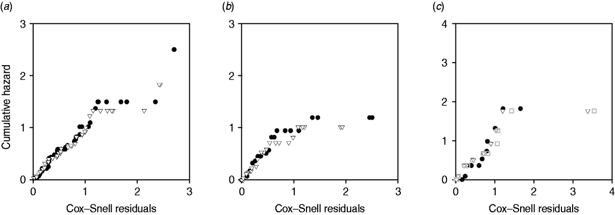 Fig. 4. Plot of Cox–Snell residuals vs. cumulative hazard for (a) exit from early shedding, (b) exit from fast-progressing latent and (c) exit from slow-progressing latent. Closed circles represent residuals from best-fitting exponential models and open triangles represent residuals from best-fitting log-normal models. The open grey squares represent the best-fitting gamma distribution in exit from slow-progressing latent (c). A model which fit the data well had data points on a 45° slope without strong deviations [Reference Dohoo, Martin, Stryhn and McPike38].