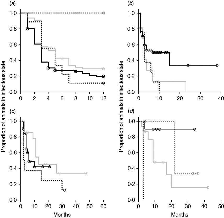 Fig. 5. Kaplan–Meier survival plots for (a) exit from exposed and (b) exit from early shedding, (c) fast-progressing latent and (d) slow-progressing latent by exposure strategy (single or multiple dose). Solid lines indicate different exposure categories; black lines indicate single-exposure infections and light grey lines indicate multiple-dose exposures. Dotted lines indicate studies of natural-exposure infections (absolute dose unknown) from three specific studies: black dots [Reference Rankin21], dark grey dots [Reference Rankin22], light grey dots [Reference McDonald28].