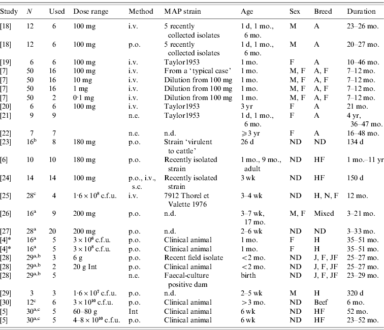 (a additional animals were uninfected controls; b additional animals were vaccinates; c strains from different species used on the remaining calves).