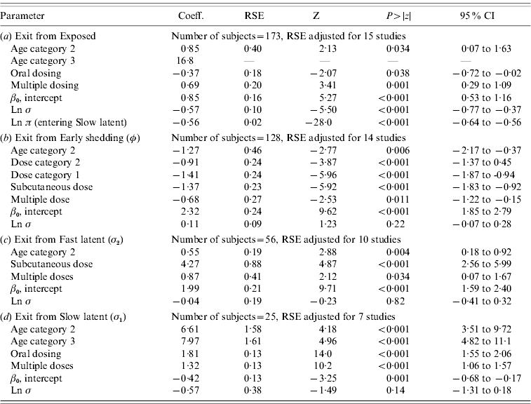 For the split-population model for exit from exposed compartment, only the log-normal distribution could be evaluated due to software limitations. For all other models, the hazard function was estimated using maximum-likelihood estimators to select the best representation of duration of stay in a compartment. Five statistical distributions were evaluated: exponential, Weibull, log-logistic, log-normal and generalized gamma. Age, dose and method of infection were included in all initial models and non-significant parameters were removed in a stepwise backwards fashion. If any age or dose category was significant, then all three age or dose categories were maintained in the final model. When models were nested, model fit was hierarchically tested by likelihood ratio statistics. Akaike's Information Criteria (AIC) and plots of cumulative hazard vs. Cox–Snell residuals were used to select the most appropriate overall model distribution.