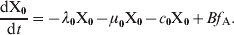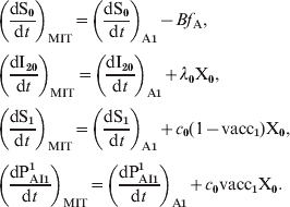 $$\openup 3pt{ \eqalign{\tab \left( {{{{\rm dS}_{\setnum{0}} } \over {{\rm d}t}}} \right)_{{\rm MIT}} \equals \left( {{{{\rm dS}_{\setnum{0}} } \over {{\rm d}t}}} \right)_{{\rm A\setnum{1}}} \minus Bf_{\rm A}\comma \cr \tab \left( {{{{\rm dI}_{\setnum{2}{\setnum{0}}}} \over {{\rm d}t}}} \right)_{{\rm MIT}} \equals \left( {{{{\rm dI}_{\setnum{2}{\setnum{0}}}} \over {{\rm d}t}}} \right)_{{\rm A\setnum{1}}} \plus \lambda _{\setnum{0}} {\rm X}_{\setnum{0}}\comma \cr \tab \left( {{{{\rm dS}_{\setnum{1}} } \over {{\rm d}t}}} \right)_{{\rm MIT}} \equals \left( {{{{\rm dS}_{\setnum{1}} } \over {{\rm d}t}}} \right)_{{\rm A\setnum{1}}} \plus c_{\setnum{0}} \lpar 1 \minus {\rm vacc}_{\setnum{1}} \rpar {\rm X}_{\setnum{0}}\comma \cr \tab \left( {{{{\rm dP}_{{\rm AI}\setnum{1}} ^{\setnum{1}} } \over {{\rm d}t}}} \right)_{{\rm MIT}} \equals \left( {{{{\rm dP}_{{\rm AI}\setnum{1}} ^{\setnum{1}} } \over {{\rm d}t}}} \right)_{{\rm A\setnum{1}}} \plus c_{\setnum{0}} {\rm vacc}_{\setnum{1}} {\rm X}_{\setnum{0}}. \cr}} \hfill$$where the subindex MIT denotes the magnitude considering maternal immunity transmission and the subindex A1 denotes the expression given in the formula (A1). Taking τM = 2·5 years we obtain for the CP1A-MDI scenario: f A = 0·12.
