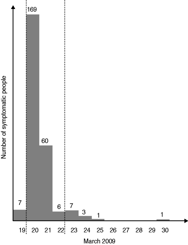 The epidemic curve (Fig. 1) shows the number of symptomatic people according to the date of symptom onset. The onset of symptoms for the majority of people who fell ill was during a 2-day period (20–21 March). The symptoms most commonly reported were nausea (88%), vomiting (77%), abdominal cramps (72%), headache (57%), diarrhoea (48%), and fever (39%).