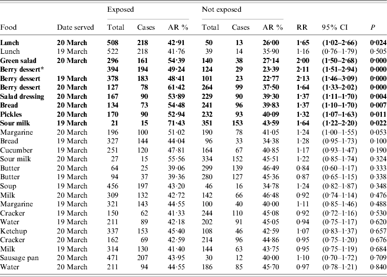 Attack rates (AR) and relative risks (RR) with 95% confidence intervals (CI) were calculated for lunch on 19 and 20 March as well as for individual dishes and food items. Fisher's exact test was used to check probability. The possible interactions between individual exposures were assessed by testing the difference in RR in groups of exposures. Multivariate analysis was conducted using logistic regression, the model used included all variables with a P value <0·05 in the univariate analyses. The results of multivariate analyses are reported as adjusted odds ratios (aOR) with 95% CI. Data were analysed by Stata version 10.1 (Stata Corporation, USA).