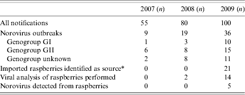 In 2009, a total of 21 raspberry-linked outbreaks were found (Table 2). These outbreaks alone accounted for the increase in the number of notifications regarding food- and waterborne outbreaks in 2009, compared to the previous year. They also explained the increased proportion of norovirus outbreaks of all notified outbreaks. Genotype GII.4 was the most common finding from the raspberry-linked outbreaks detected in Finland in the spring of 2009. This genotype has previously been linked mostly to person-to-person transmission [Reference Verhoef23]. In one of the outbreaks in August, norovirus genotype GI.4 was found in patient samples. Even if the result of the viral investigation of the raspberries remained negative in this investigation, Polish raspberries originating from the same wholesaler tested positive for norovirus GI.4 in October, and also proved to have caused several raspberry-linked outbreaks later in the same year [Reference Maunula11].