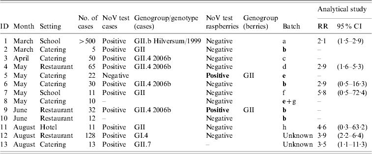 Investigations of these 13 outbreaks varied greatly. An analytical epidemiological study had been conducted in 7/13 outbreaks. All the seven studies showed an elevated RR for consumption of raspberries (Table 3). In addition to the epidemic curve consistent with a point-source outbreak and an incubation period fitting to norovirus infection, positive norovirus test from patients' stool samples was the crucial evidence in 10 outbreaks, a positive raspberry sample in one outbreak, and tracing back the batch of raspberries to one of the batches that had tested positive during another investigation in two outbreaks.