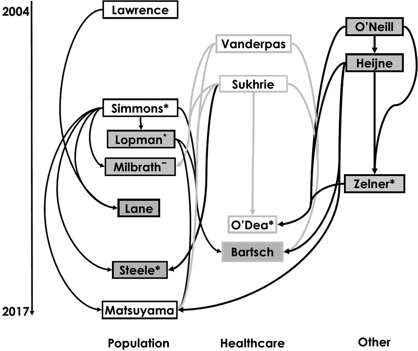 Fig. 1. Diagram of citations between reviewed works divided by setting [Reference Lopman10, Reference O'Neill and Marks20, Reference Matsuyama, Miura and Nishiura21, Reference Milbrath31, Reference Simmons35, Reference Lawrence43, Reference Zelner46–Reference Vanderpas48, Reference Sukhrie52–Reference Bartsch54, Reference Lane59, Reference Steele69]. Boxes show first authors of each study. Arrows denote that the study may have been influenced by earlier studies, established through citation, and arrow colour varies for ease of reading. Boxes with white backgrounds indicate a study has estimated and provided a novel value of a reproduction number. Superscript symbols denote co-authorship with * indicating co-authorship with Lopman; ° Simmons and ~ Zelner.