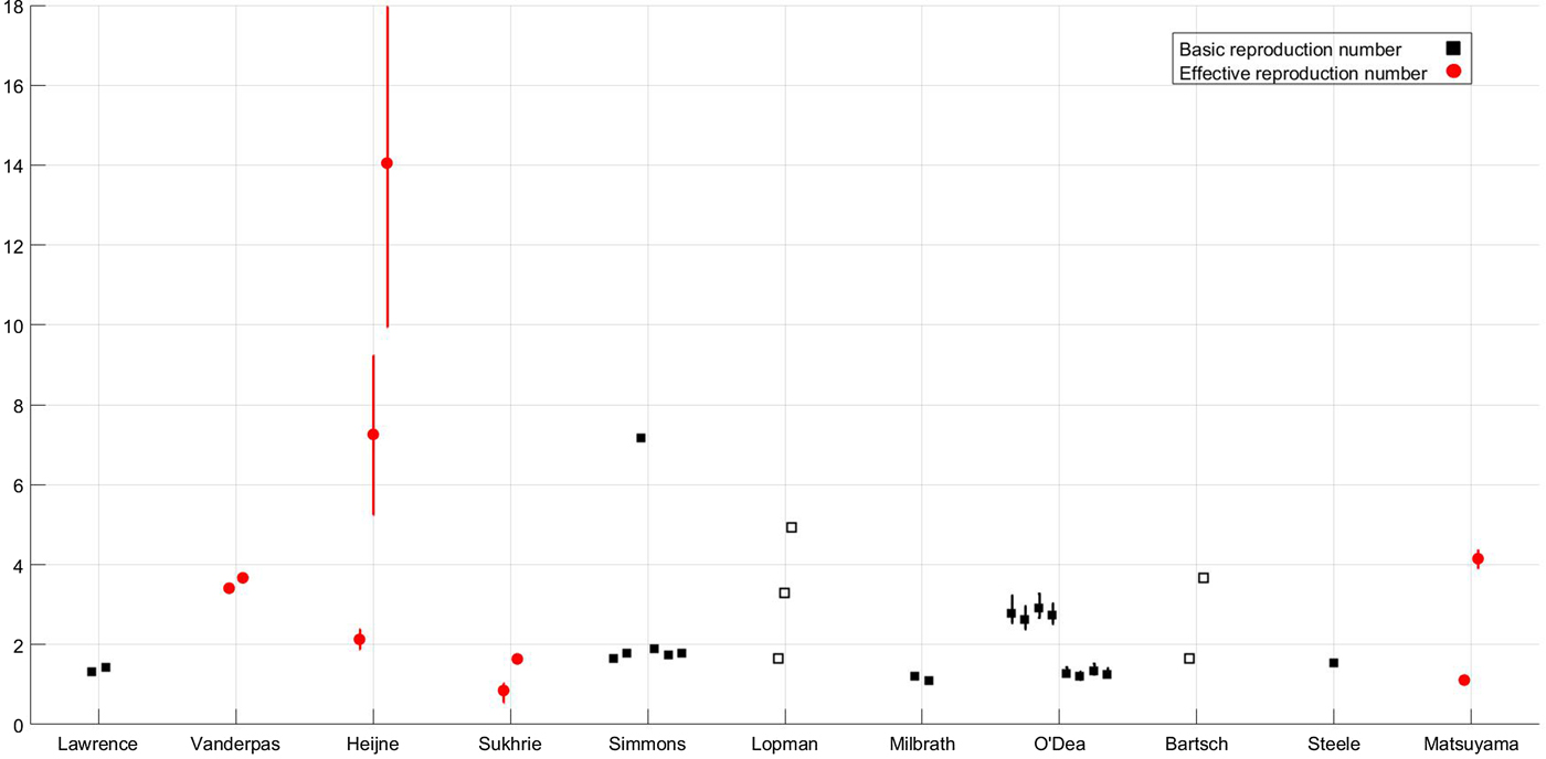 Fig. 2. Reproduction number values for the subset of studies, shown in Fig. 1, where reproduction numbers are explicitly mentioned; the x-axis denotes first author [Reference Lopman10, Reference Matsuyama, Miura and Nishiura21, Reference Milbrath31, Reference Simmons35, Reference Lawrence43, Reference Heijne47, Reference Vanderpas48, Reference Sukhrie52–Reference Bartsch54, Reference Steele69]. Squares denote individual values of the basic reproduction number according to the definition given in the Aims section; circles denote individual values of the effective reproduction number according to the definition given in the Aims section. Filled shapes denote that the value was estimated, empty shapes denote that the value was assumed and lines denote 95% confidence interval ranges if provided. Where mutliple reproduction number values are estimated for different situations, detailed in text, all values are shown.