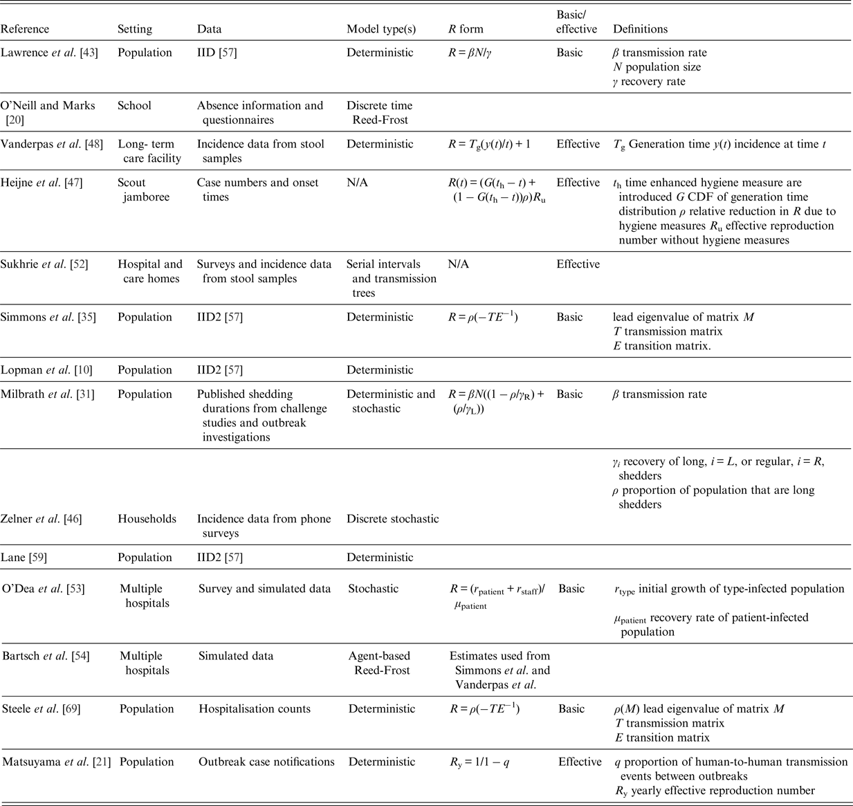 Table 1. Summary of reviewed studies and their reproduction number estimates where appropriate [Reference Lopman10, Reference O'Neill and Marks20, Reference Milbrath31, Reference Simmons35, Reference Lawrence43, Reference Zelner46, Reference Vanderpas48, Reference Sukhrie52–Reference Bartsch54, Reference Lane59, Reference Steele69]