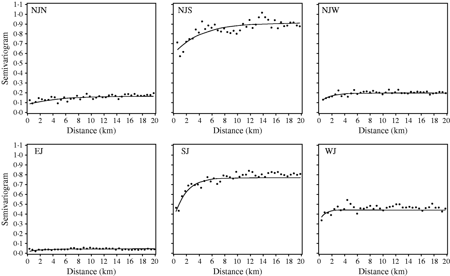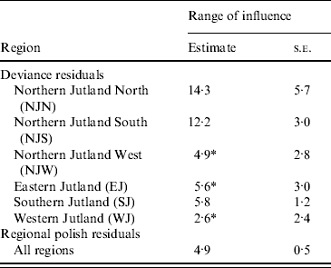 The regional polish residuals effectively reduce the large-scale variation. A semivariogram can be estimated for all six regions in Jutland together (Fig. 4). This was not possible when using the deviance residuals without regional polish. The standard error of the range of influence parameter estimate was small (0·5 km) compared to the similar standard errors for the range of influence parameter estimates for each of the six regions separately (min–max: 1·2–5·7 km).