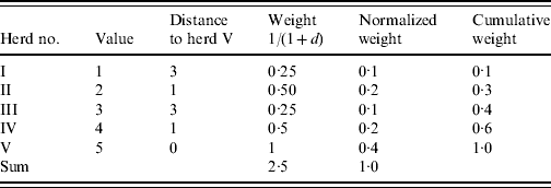 As an example consider a herd (herd V) with four neighbouring herds (herds I–IV) (Table 1). In order to find the weighted median value of herd V an inverse distance weight function is used [1/(1+d), where d is a unit of distance]. The cumulated weight equals or exceeds 0·5 corresponding to the value 4 which is the weighted median. An ordinary (unweighted) median would give the value 3.