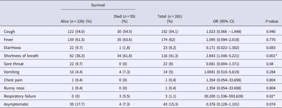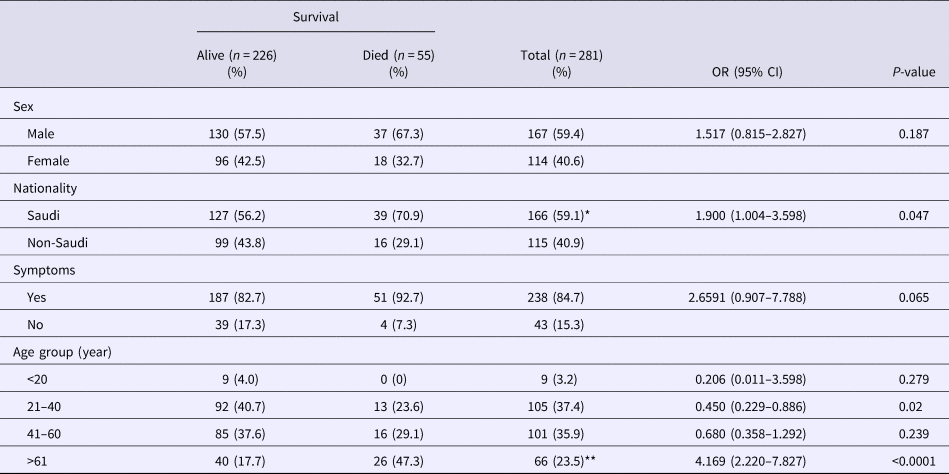 In the present study, the mortality rate was 20% among the 281 confirmed cases of MERS-CoV infection in Saudi Arabia between 23 April 2014 and 7 June 2016. Mortality was higher in male patients, with a male-to-female ratio of 1.45:1. The predominance of male cases is consistent with the findings reported in previous studies in Saudi Arabia and South Korea [Reference Chen19, Reference Bermingham20], which may be associated with cultural or occupational behaviours in males that increase the risk of infection. Saudi citizens showed significantly higher mortality than non-Saudi citizens. The demographic features of the laboratory-confirmed cases of MERS-COV infection in the current study showed that only nine patients were aged <20 years; 73.2% were aged 21–60 years and 23.5% were aged >61 years. These findings are in agreement with those of previous studies reported in Saudi Arabia [Reference Cauchemez14, Reference Cauchemez21–Reference Aleanizy23]. In addition, the higher mortality rate among elderly patients (>61 years) is consistent with the rate reported in a previous study [Reference Al-Shehri24]. A possible explanation for this may be age-associated immunosenescence, which results in a suboptimal immune response in these individuals following exposure to MERS-CoV [Reference Aly25] and the possible interference of underlying comorbidities in elderly patients cannot be ruled out. The clinical presentations of MERS-CoV cases observed in this study have similar symptomatology and frequency to those previously reported [Reference Assiri10, Reference Assiri13, Reference Al-Tawfiq18]. Remarkably, among the noted symptoms, SOB and respiratory failure were significantly associated with higher mortality.