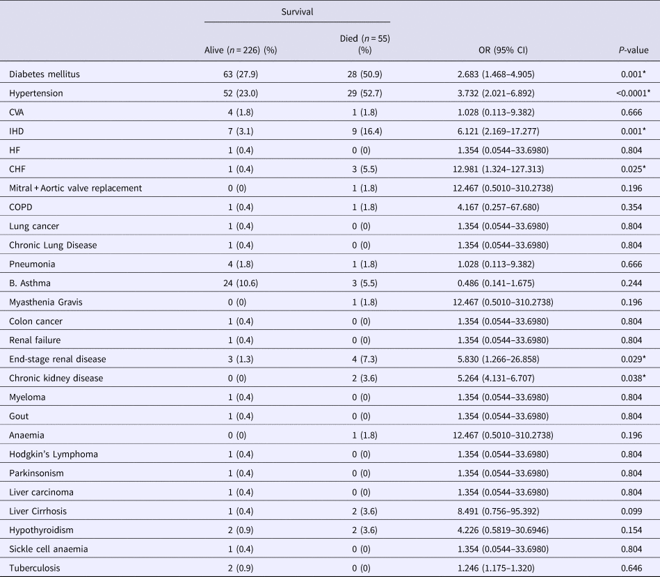 In this study, chronic conditions such as DM, HTN, IHD, CHF and renal disease significantly influenced the severity of MERS-CoV. The observed increase in the mortality rate in MERS-CoV patients with underlying chronic conditions corroborates the findings of earlier studies in Saudi Arabia [Reference Assiri13, Reference Al-Tawfiq18]. This is also in line with the findings for other respiratory diseases such as influenza [Reference Mertz26], influenza A H1N1 [Reference Kusznierz27, Reference Suryaprasad28] and SARS [Reference Moni and Lio29]. A recent study found that obesity, cardiovascular, hypertension and neuromuscular disease were strongly associated with severe pandemic influenza [Reference Mertz26]. In SARS, comorbidities such as immunological, neurological, metabolic and dermatologic diseases were strongly associated with the disease [Reference Moni and Lio29]. These conditions are known to weaken the host's innate and humoral immune systems, thereby limiting their ability to counteract any new infection [Reference Park30].