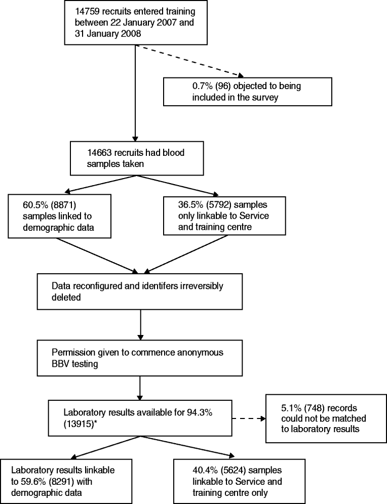 Fig. 1. Flow diagram of the unlinked anonymous survey of blood-borne viruses (BBVs) in military recruits. * Samples that were found to be indeterminate for markers of BBVs were excluded from the numerator and denominator.