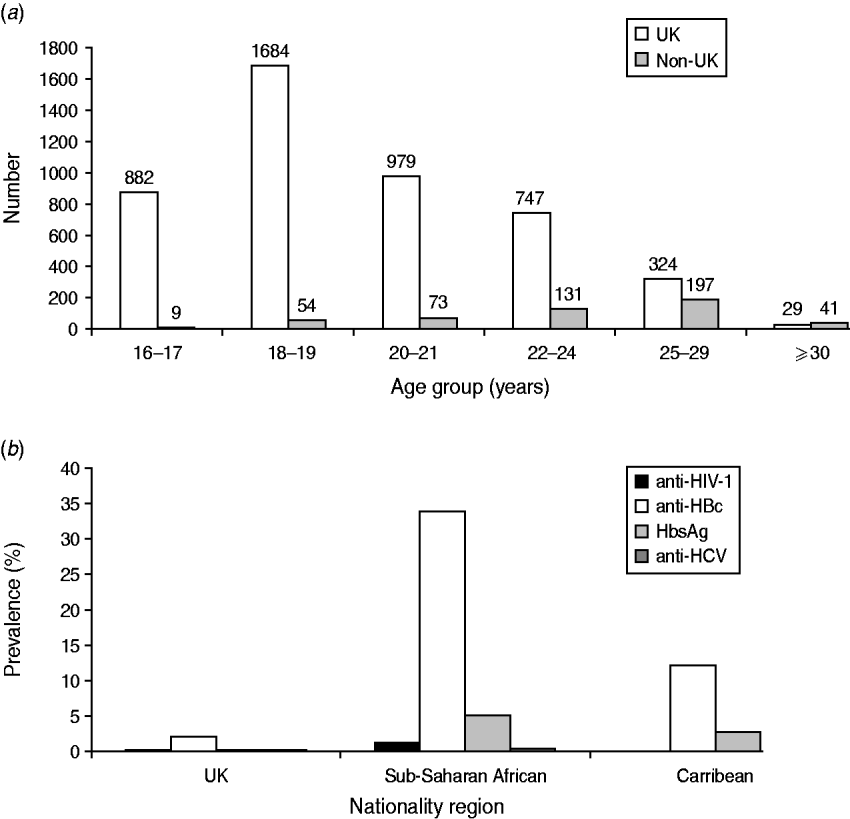 Fig. 2. Age distribution and blood-borne virus (BBV) prevalence by nationality. (a) Number of UK and non-UK military recruits entering training by age group. (b) Prevalence of BBV by nationality region.