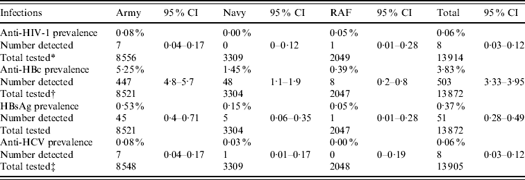 Overall, the prevalence of anti-HIV-1 was measured at 0·06% [8/13 914, 95% confidence interval (CI) 0·03–0·12]. The prevalence of anti-HBc and HBsAg was 3·63% (503/13 872, 95% CI 3·33–3·95) and 0·37% (51/13 872, 95% CI 0·28–0·49), respectively. The prevalence of anti-HCV was 0·06% (8/13 905, 95% CI 0·03–0·12). For both HIV and hepatitis C there was no significant difference in prevalence between the three Services (Table 1). For both anti-HBc and HBsAg, the prevalence was significantly higher in Army recruits compared to each of the other two Services (P<0·001).
