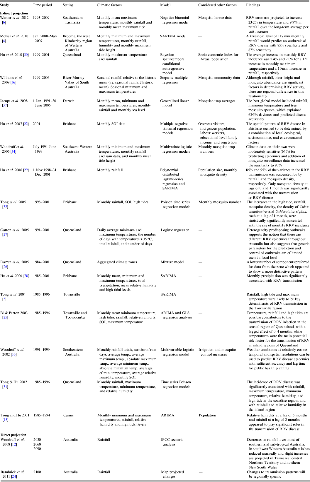 There were generally three steps in the published research to assess the pre-existing association between RRV and climate. First, the model was developed using various independent variables with RRV as the dependent variable. Various models were used in the included articles. The two main models were seasonal auto-regressive integrated moving average (SARIMA) and auto-regressive integrated moving average (ARIMA) used in six of the studies, various regression models were used in seven studies and four others [Intergovernmental Panel on Climate Change (IPCC) scenario analysis, change mapping, mixed models, generalized linear models (see Table 1)]. Some studies used more than one model to compare the results [Reference Bi and Parton25, Reference Hu29]. Second, model fit was checked. Finally, the model was verified by predictive variables matched to the actual observations. The criteria for choosing a model included Bayesian Information Criterion [Reference Jacups37], Akaike's Information Criterion (AIC) [Reference Hu28], change in AIC (ΔAIC) [Reference Jacups37], goodness-of-fit test [Reference Tong, Hu and McMichael5, Reference Gatton, Kay and Ryan27, Reference Hu29, Reference Woodruff33, Reference Woodruff34], and Deviance Information Criterion [Reference Darren, Zerger and Argent26, Reference Hu30].