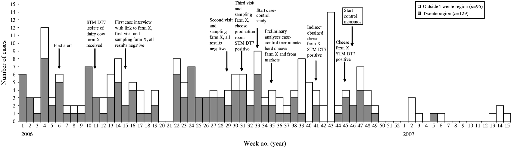 The Outbreak Investigation Team acknowledge several colleagues of the Epidemiology Department of the RIVM, especially Alies van Lier, Anita Suijkerbuijk, and Anneke Westerhof for help in interviewing cases and controls; Henny Maas, Anjo Verbruggen and Frans Bensink for help in phenotyping of the Salmonella isolates, Mona van Spijk, from the LTO, Noord for advice during the investigation, Antoon Mentink from The Netherlands controlling authority for milk and milk products for his efforts and input on the control measures and Dr Lindstedt of the Norwegian Institute of Public Health for MLVA-typing some of the Salmonella isolates early in the outbreak. Finally, we thank the Enternet participants for their response to the request for action and specifically Wolfgang Rabsch of the Wernigerode Branch of the Robert Koch Institute for sharing some German S. Typhimurium DT7 strains with our laboratory. The work was within the routine activities financially supported by the Ministry of Public Health, Welfare and Sports and local public health funds.