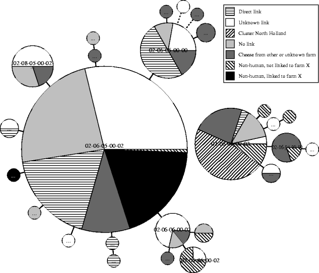 The attributive fraction for proven consumption of dairy products or direct animal contact from farm X may seem relatively low (31%). However, many cases might have consumed contaminated cheese from this particular farm via other cheese sale outlets, who purchased the cheese either directly from the farm (in the region) or from two main wholesalers (nationwide). Only in late November 2006, did the lists of buying shops from these wholesalers become available. These showed that 125 different sales outlets had bought in total at least 2442 cheeses produced at farm X in weeks 1–34 in 2006. At least 156 (6%) of these cheeses were still in stock at one wholesaler and were destroyed. The number of cheeses destroyed by the second wholesaler is unknown. Since for many cases information on places where they had purchased their cheese in the risk period was limited, it was not possible to assess all cases exposed to the contaminated cheese retrospectively. Consequently, true exposure to cheese from farm X was underestimated by the available questionnaire data.