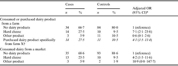 In the case-control study, 51 cases and 105 matched controls were included. Of the 51 matched sets, 37 (73%) were resident in the Twente district. Risk factors univariately associated with disease with a P value <0·20 were: visit to a farm; or consumed or bought hard cheese, herb cheese, milk, butter milk and yoghurt from a farm; or consumed or bought dairy products in general and hard cheese specifically from a market. Conditional multiple logistic regression analyses indicated that cheese purchased from a farm, and specifically from dairy farm X and from a market stall, were associated with infection with STM DT7 (Table 1). Overall, 27 (53%) of the cases in this study reported one of these two risk factors.