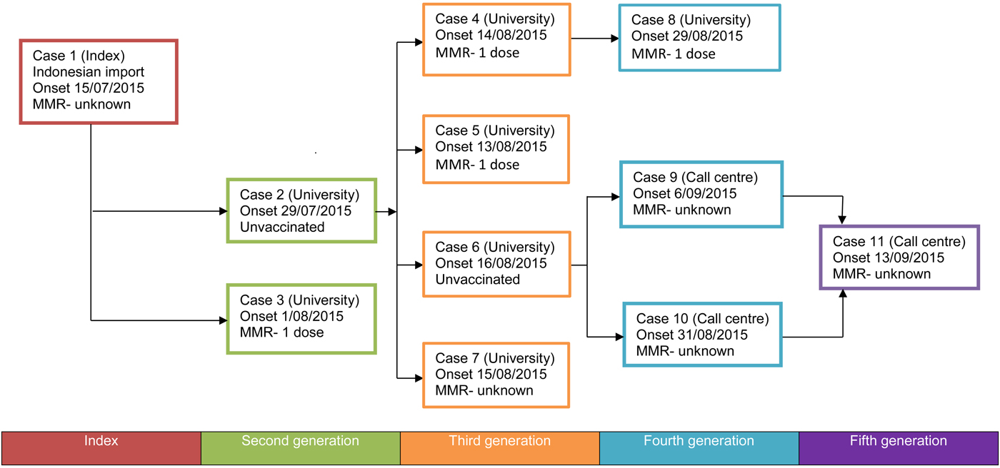 Three further cases (cases 8–10) were thought to be fourth-generation cases. Case 8 was a university contact of case 4 and travelled to the Gold Coast, a nearby metropolitan centre, while infectious. While written vaccination records were unavailable for case 8, a verbal history of receipt of MCV in Malaysia in early childhood was reinforced by serology consistent with previous vaccination. Case 8 also received a dose of prophylactic MMR 2 days after exposure to case 4. Cases 9 and 10 were workplace contacts of case 6. A single fifth-generation case (case 11) was a workplace contact of cases 9 and 10. Case 11 did not work whilst infectious.