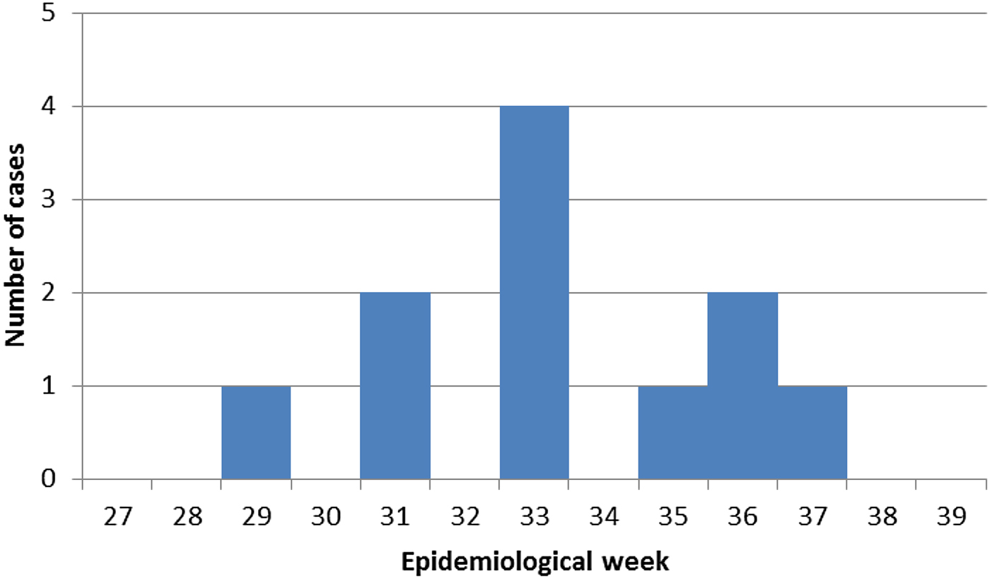 Fig. 2. Epidemic curve for measles outbreak, Australia, 15 July 2015 to 13 September 2015.