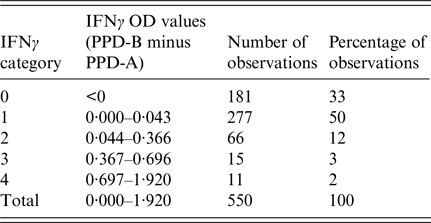 The ‘risk factor’ of interest included as the explanatory variable in the model was the IFNγ titre at the first time each badger was tested. The IFNγ titre for each badger was calculated as the quantity of IFNγ produced following stimulation with bovine tuberculin purified protein derivative (PPD-B) minus the amount of IFNγ produced by stimulation with avian tuberculin purified protein derivative (PPD-A) [Reference Dalley4]. Continuous IFNγ OD values were used to produce five categories of IFNγ results for analysis (Table 1). Because the distribution of data points was highly right-skewed it was not considered appropriate to simply divide the range of values by the number of categories in order to obtain cut-off values. Therefore, negative values (arising from cases where the OD of PPD-A was higher than that for PPD-B) were coded as category 0 (zero), while values higher than zero but <0·044 – the current cut-off value for infection in adult badgers [Reference Dalley4] – were coded as category 1. Categories 2 and 3 were equally spaced (starting from 0·044) using an interval step of 0·33. The category coded as 4 included values higher than 0·70 with the highest IFNγ OD value being 1·92 (Table 1).