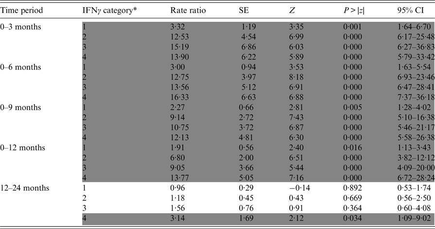 Data are derived from five Cox regression models, each of which was run for a different time period (defined as the interval between the IFNγ test being conducted and a subsequent Stat-Pak test on the same badger). Rate ratios were calculated by comparing the incidence of positive Stat-Pak test results for badgers in each IFNγ category to a baseline rate (category zero in Table 1), which was allowed to vary by time period (proportional hazard assumption). Significant differences from baseline are shaded in grey. As an example, to determine the relative chance of a badger with an IFNγ titre of 0·50 subsequently testing Stat-Pak positive 12 months later, compared with a badger with an initial IFNγ titre of zero, first determine the category of IFNγ using Table 1: in this example it would be category 3 (because the IFNγ OD value falls within the range of 0·367–0·696); then look at the rate ratio for this category in time period 0–12 months. The rate ratio of 9·05 can be interpreted as badgers with an IFNγ OD value of 0·50 being nine times as likely to test Stat-Pak positive up to a year later than are badgers with an IFNγ OD value of zero.