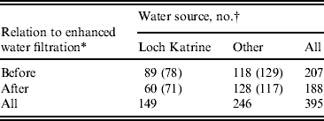 Table 1. Distribution of cases of cryptosporidiosis in Greater Glasgow & Clyde NHS Board area by drinking-water source, before and after the introduction of filtration on Loch Katrine water, Scotland