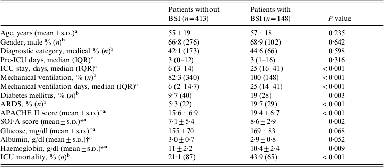 Table 1. Demographic and clinical data of ICU patients with and without BSIFootnote *