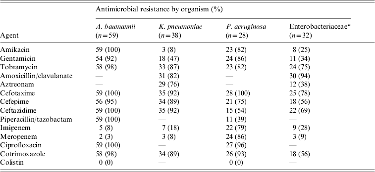 Multidrug-resistant A. baumannii was the most frequent single organism isolated from this series of BSIs. A. baumannii isolates have an increasing resistance to many antimicrobials, and exhibit a propensity for clonal spread. Indeed, the present study was performed 1 year after our unit had experienced an outbreak of multidrug-resistant A. baumannii [Reference Kraniotaki33] which has since become endemic in the unit. Data regarding molecular typing of the A. baumanni isolates are not available for the study period and this is a limitation of the study. In accordance with this finding recent microbiological data derived from the ongoing Greek System for the Surveillance of Antibiotic Resistance [9] have shown an increase in the proportion of imipenem-resistant A. baumannii isolates [Reference Falagas34]. Similarly, multidrug-resistant Gram-negative pathogens including Acinetobacter spp. predominated in high numbers in isolates causing BSIs particularly in ICUs, in two recent studies from Asia [Reference Wu35, Reference Jerassy36]. These findings along with the reported increased proportion of Acinetobacter spp. associated with ICU pneumonia in the United States [Reference Gaynes and Edwards30] indicate that this is a worldwide issue.