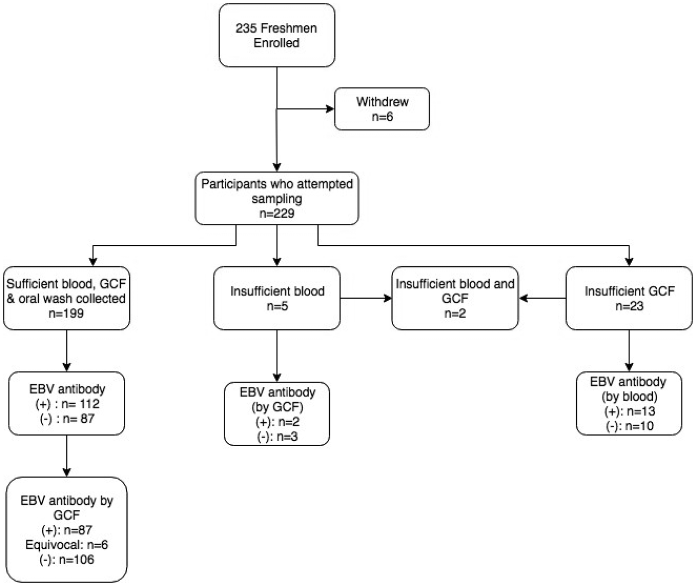 Figure 1 displays the enrolment summary and EBV antibody prevalence. Six of the 235 students enrolled but withdrew before sample collection. Thirty (13%) of the 229 students who attempted sample collection did not have a sufficient volume of gingival swab fluid or blood for antibody testing. All 229 students completed an oral wash. Of the 199 students who successfully provided all three samples, six subjects had equivocal gingival swab antibody results, leaving 193 subjects for comparison of antibody status.