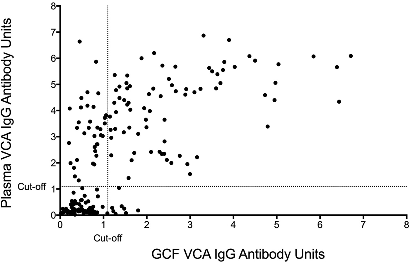 Fig. 2. GCF vs. blood plasma EBV VCA IgG EIA antibody units. Cut-off by the manufacturer's instructions.