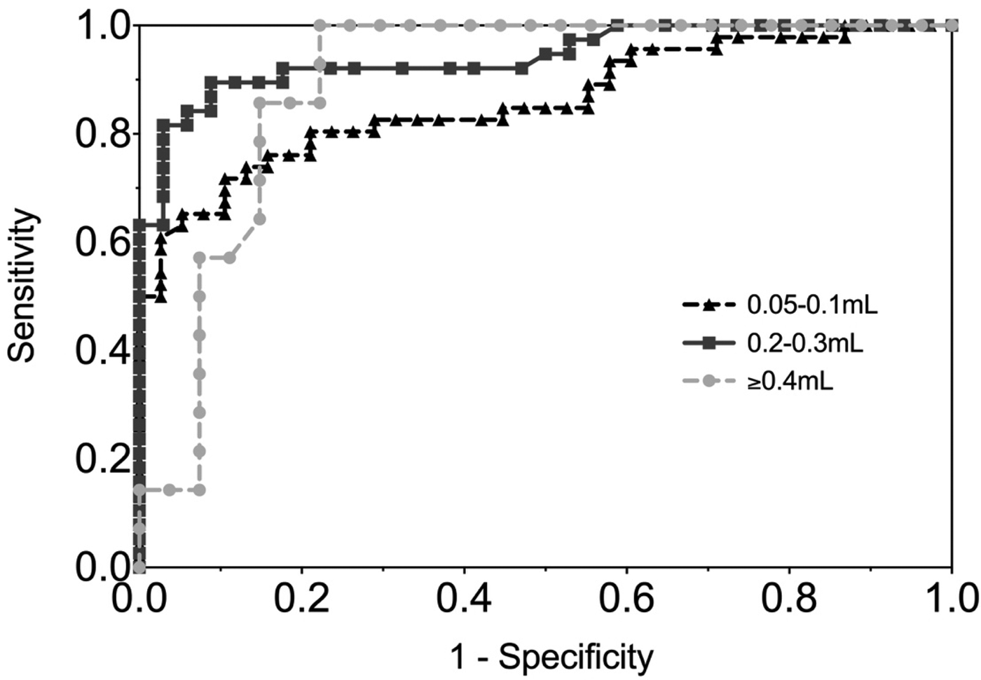Fig. 4. ROC curve of EBV VCA IgG antibody in GCF by volume of GCF collected. 0.05–0.1 mL AUC = 0.86 (0.78, 0.94), 0.2–0.3 mL AUC = 0.94 (0.89, 0.99), ⩾0.4 mL AUC = 0.90 (0.80, 0.99).