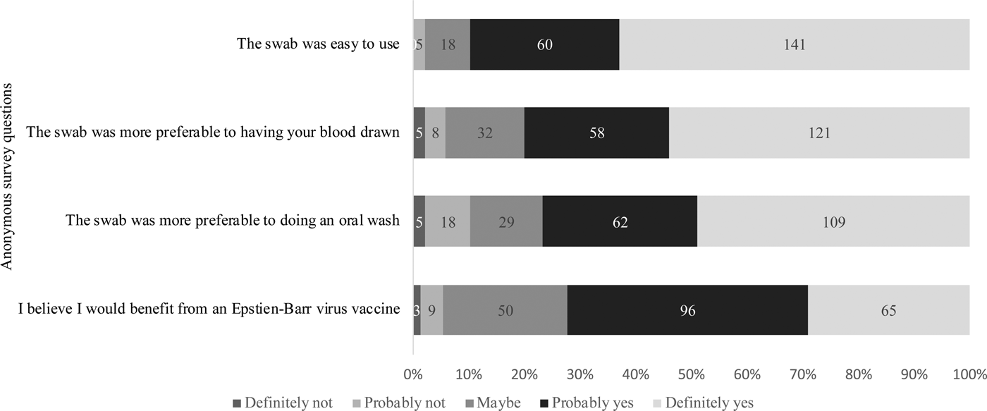 Of the 229 students who attempted sample collection, 224 completed the anonymous questionnaire regarding their attitudes on using the swab and the value of an EBV vaccine. As shown in Figure 5, 201 (90%) students agreed with the statement that the swab was easy to use. When compared with having their blood drawn or doing an oral wash, 94.2% and 89.7% found the swab more preferable, respectively. Students were also asked about their awareness of EBV and their opinions about an EBV vaccine. Whereas 37% of students reported not knowing about EBV, 72% of students believed they would benefit from an EBV vaccine, regardless of their immune status.