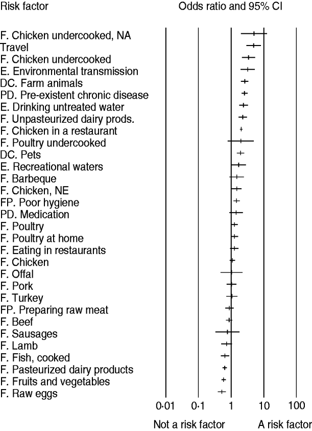 Fig. 2. Relative importance of risk factors for sporadic campylobacteriosis (odds ratio and 95% CI). F, Food; DC, direct contact; E, environmental; PD, pre-disposition; FP, food preparation; NA, North America; NE, Northern Europe.