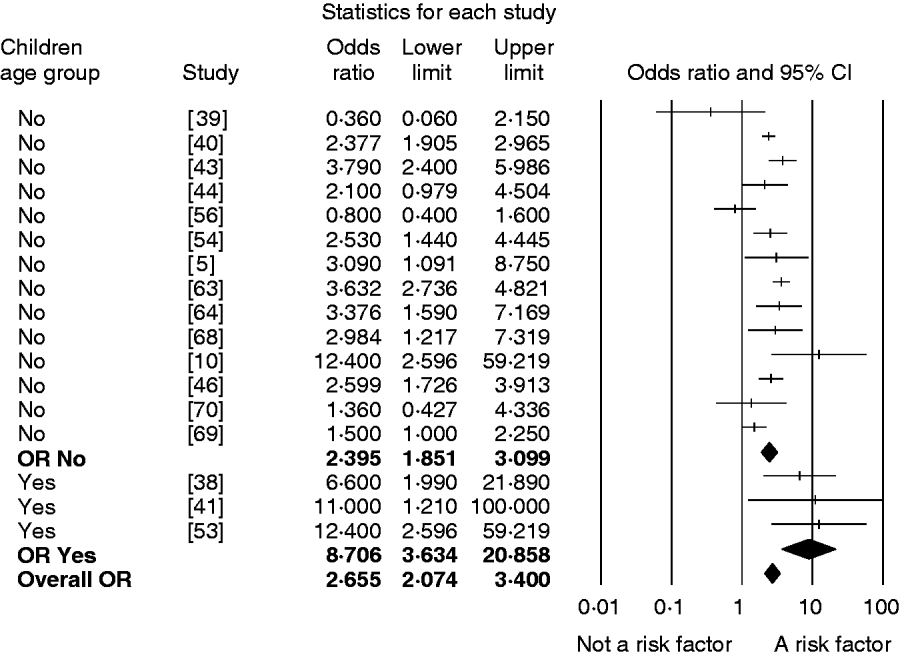 Fig. 3. Forest plot of the odd ratio (OR) of the risk of human campylobacteriosis after direct contact with farm animals for all ages (children age group=no) and only children (children age group=yes) for each of the 16 studies investigating this risk factor, the pooled OR per age group and the overall pooled OR together with the 95% confidence interval (CI).
