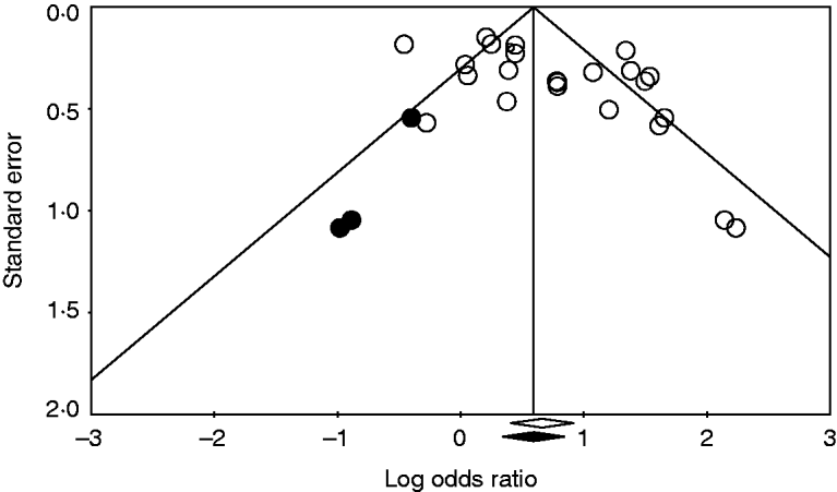 Fig. 4. Funnel plot of the logarithm pooled odds ratio (OR) of 24 studies (○) quantifying the effect of direct contact with a pet on the risk of human campylobacteriosis. The solid symbols (•) are the potential missing studies according to Duval & Tweedie's trim-and-fill method (if they had existed, the pooled effect would have shifted slightly towards the null effect; the black diamond under the x-axis).