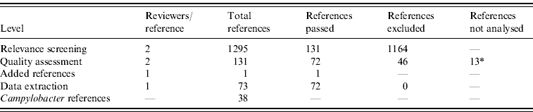 All references were independently reviewed by two reviewers, and it was sufficient that one reviewer considered it relevant for the reference to pass to the quality assessment step of the SR. Relevance of studies was assessed on the basis of specific inclusion criteria: (1) focus on human disease; (2) focus on Campylobacter or Salmonella; (3) focus on sporadic disease; (4) reference describing a case-control study.