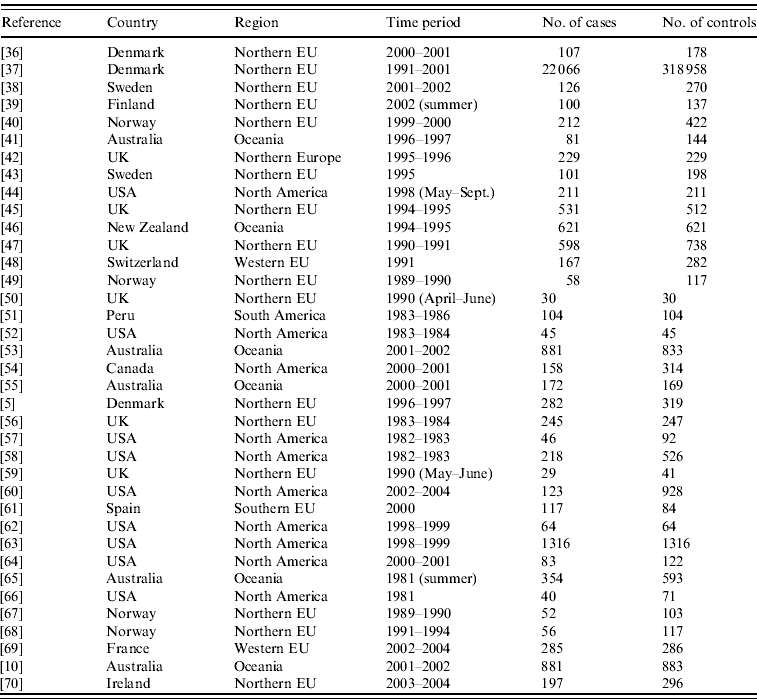 From the 72 references, 34 investigated risk factors of sporadic salmonellosis [Reference Domingues21], and 38 focused on sporadic campylobacteriosis. Campylobacter case-control studies were conducted between 1983 and 2004 in 14 different countries from three different continents. Seven studies investigated exposures in children, and two focused only on adult age groups. Most studies were designed to investigate exposures in Campylobacter in general, and only seven out of 38 investigated exposure to C. jejuni. Overall, the number of cases and controls interviewed varied between 30 (small-scale studies) and around 300 000 (community studies). All studies were published in English. The Appendix presents the complete list of Campylobacter studies collected in the SR.