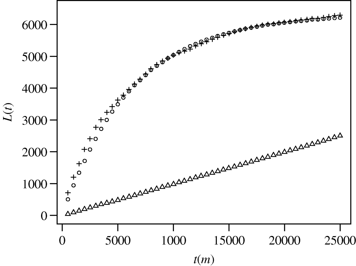 Fig. 1. Results of spatial pattern analysis of the distribution of melioidosis cases (+) and the Townsville population (○; point population distribution was determined by combining Australian Bureau of Statistics census data with cadastral lot distribution. Points were generated for each lot equal to a calculated lot population). For each 500-m interval the function K(t) was calculated and transformed to L(t) [Reference Haase18] and plotted against t. Triangles (▵) show the upper limit of the 95% confidence envelope for simulated spatial randomness (the lower limit is only slightly offset beneath the upper limit).