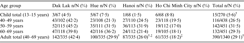 ‡ χ 2 Test P = 0·015 for comparison of Hanoi adult total and Ho Chi Minh City adult total.