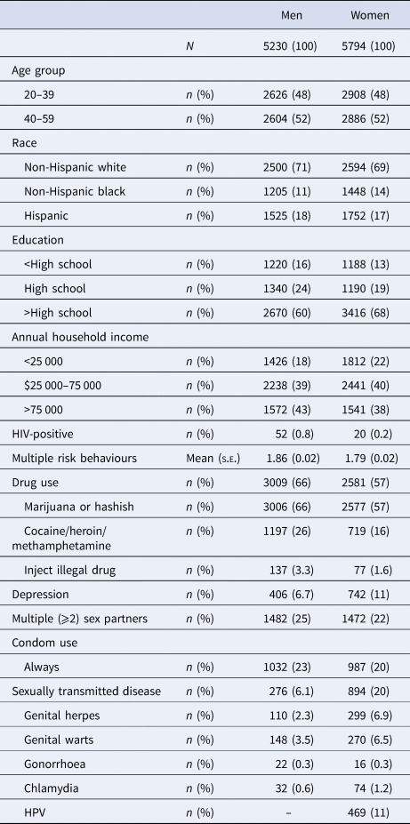 There were 5230 men and 5794 women aged 20–59 years who had data on HIV antibody test and risk behaviours (Table 1). A total of 0.8% of men and 0.2% of women were tested positive for HIV. The weighted mean of HIV risk behaviour scores was 1.86 (s.e., 0.02) among men and 1.79 (s.e., 0.02) among women. However, the prevalence of moderate-to-severe depressive symptoms was higher among women (11%) than that among men (6.7%). Moreover, 20% of women reported doctors diagnosed STDs in our sample, higher than that in men (6.1%), primarily due to 11% of women reporting having been told by a doctor that they had HPV.