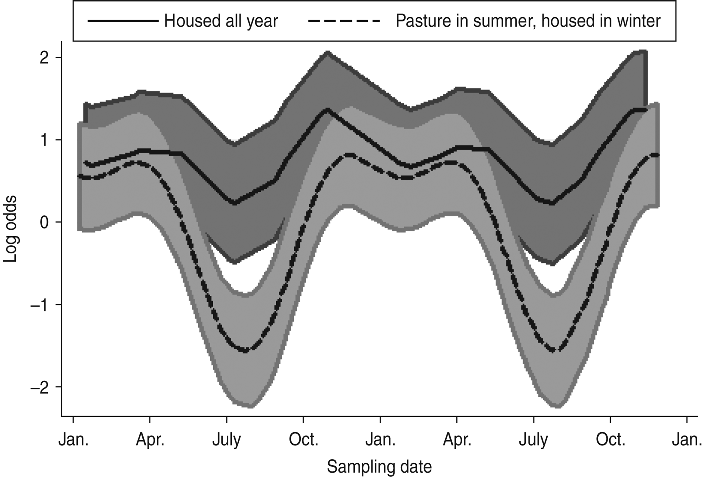 Fig. 1. Seasonal variation of estimated Arcobacter spp. faecal pat prevalence in cattle, adjusted for management system and other covariates. Shaded areas represent 95% confidence intervals.